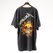 こちらは1996〜1997年のLoad/Reloadツアー期にリリースされた通称“Flame Skull(フレイムスカル/フレイミングスカル)”。フロントは燃え上がる炎に溶け込むドクロと鋭利なメタリカロゴ、バックには太陽のように放射するスカルを大胆にプリント。これらはMETALLICAとのコラボで知られるアーティスト Pushead(パスヘッド) によるデザインで、彼特有の腐食感や毒気を孕んだ描線が全開に表現されている。スケート、パンク、メタルの文化を横断したパスヘッドの世界観が凝縮された名作グラフィックのひとつ。